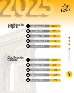 El grupo se redujó en la subida al exigente Col du Soulor, premio de primera categoría. Allí se impuso el canadiense Michael Woods, con Rubio y Buitrago presentes. A sus espaldas el líder de la clasificacióon general, Ben Healy, perdió la rueda de los favoritos.