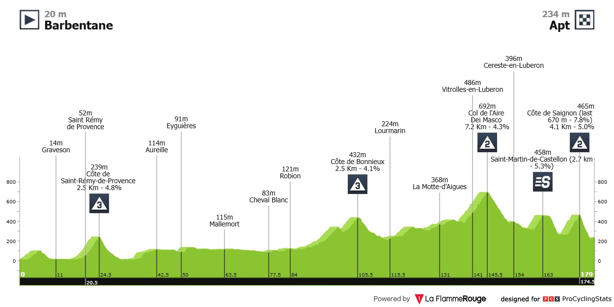 La etapa contará con 179,3 kilómetros entre Barbentane y Apt, un espacio para que la fuga intente la victoria o la general empiece a marcar su destino.