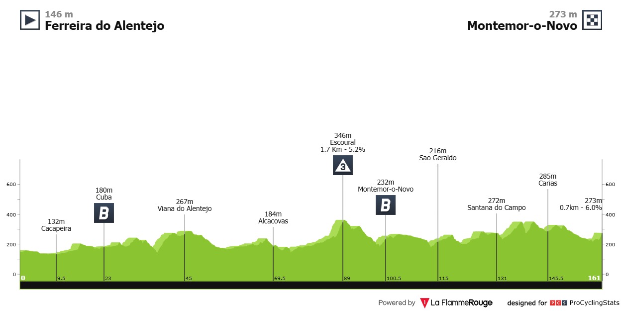 Mañana nuevamente un terreno quebrado volverá a hacerse presente en la Volta ao Alentejo. La salida será en Ferreira do Alentejo reorriendo 160.5 kilómetros hasta Montemor o Novo.